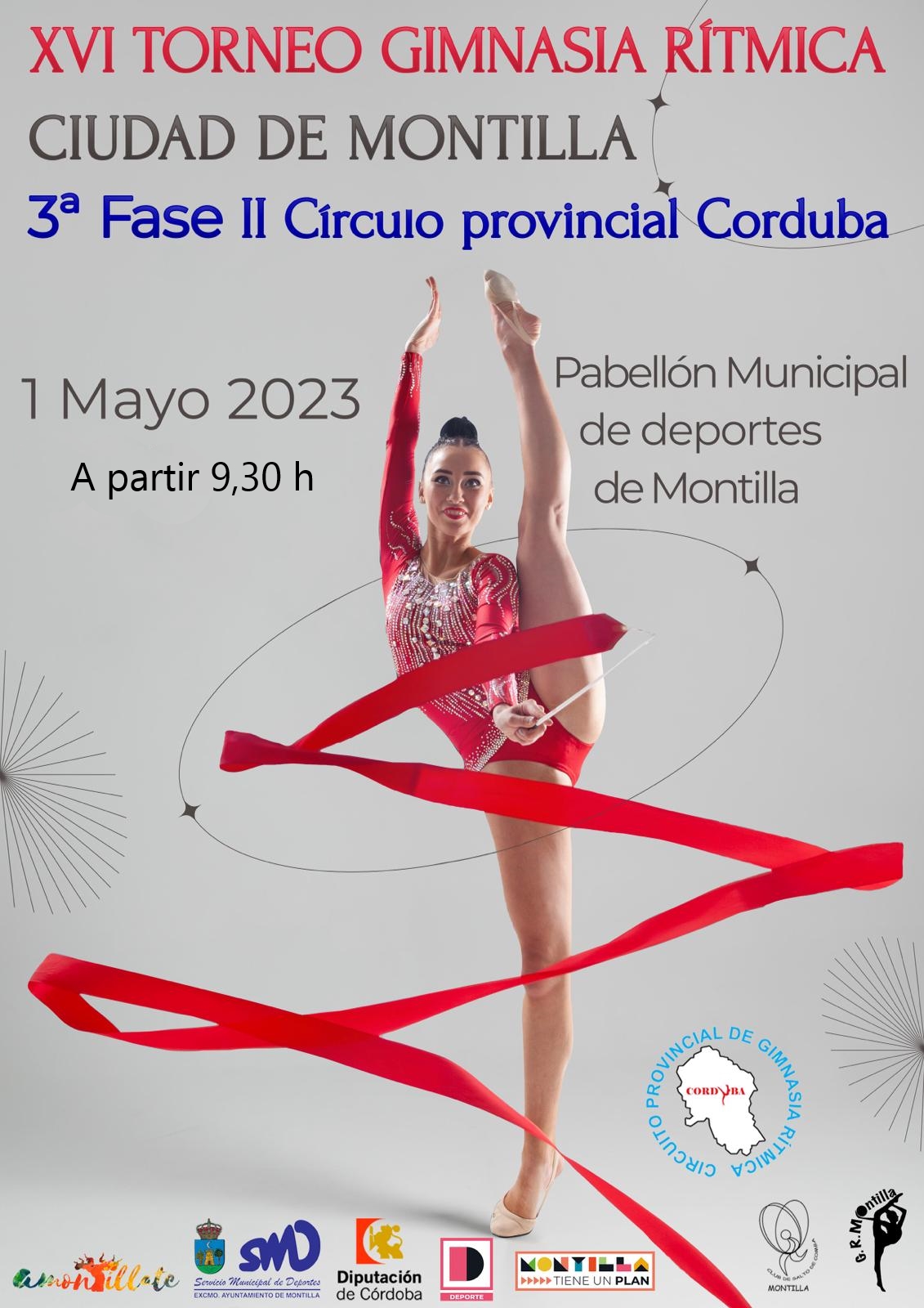Montilla acogerá este lunes 1 de mayo la 3ª fase del Circuito Diputación Provincial de Gimnasia Rítmica CORDUBA. A partir de las 9,30 h en el pabellón municipal de Deportes de Montilla tendrá lugar esta competición provincial en la que las gimnastas individuales y conjuntos de Gimnasia Rítmica Puente Genil volverán aponer a prueba sus montajes.