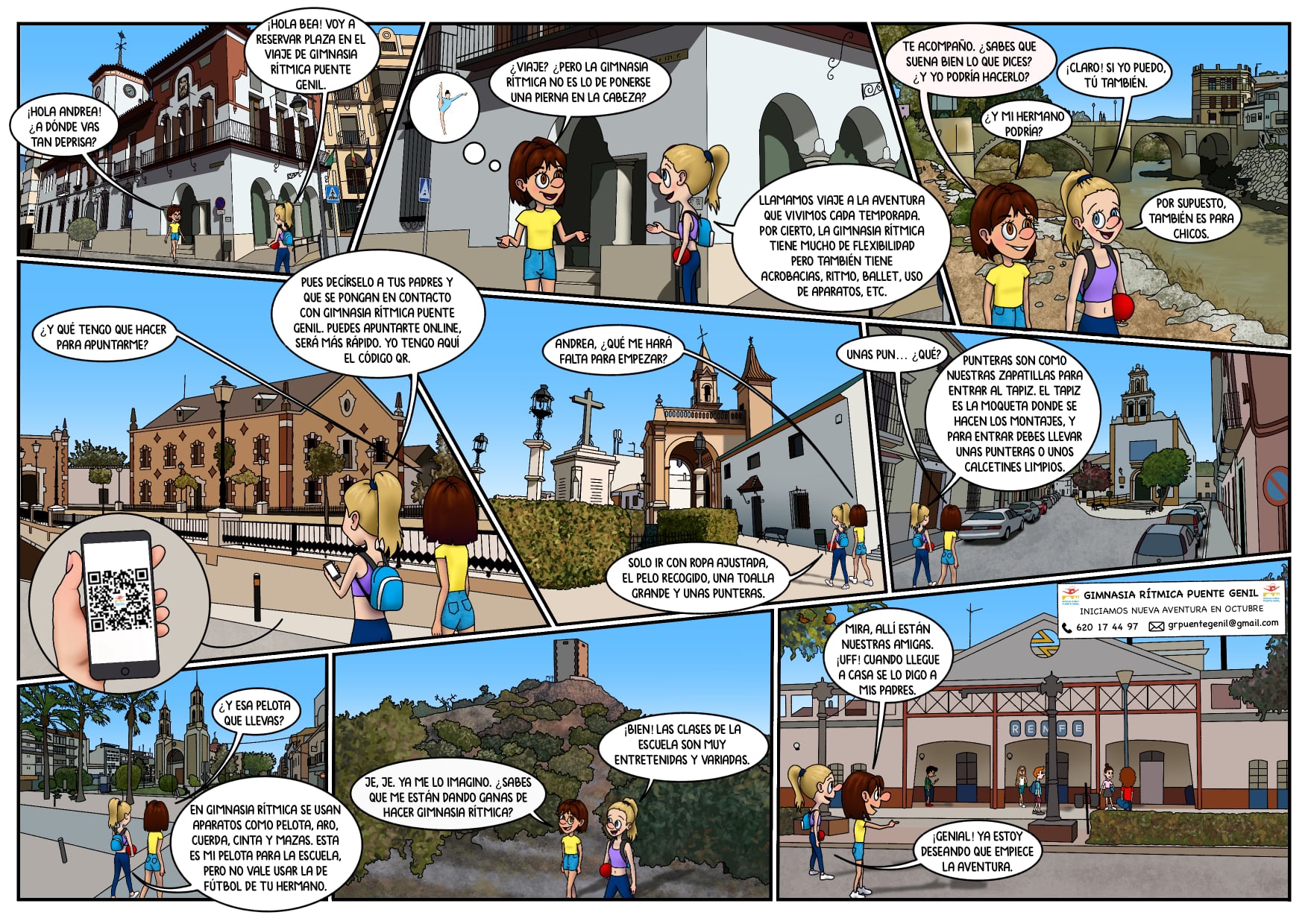 Un comic para difundir la Gimnasia Rítmica en Puente Genil. Dicen que una imagen vale más que mil palabras y nosotros recurrimos a un comic para hacer saber que la nueva aventura de la Gimnasia Rítmica comenzaba en octubre en Puente Genil. Una obra de arte la realizada por Melanie Vera Montero, la cual ensalza en sus viñetas los principales monumentos de la ciudad y nos introduce a saber que es la Gimnasia Rítmica. Agradecemos a Melanie su colaboración e implicación, entre todos haremos grande Gimnasia Rítmica Puente Genil.