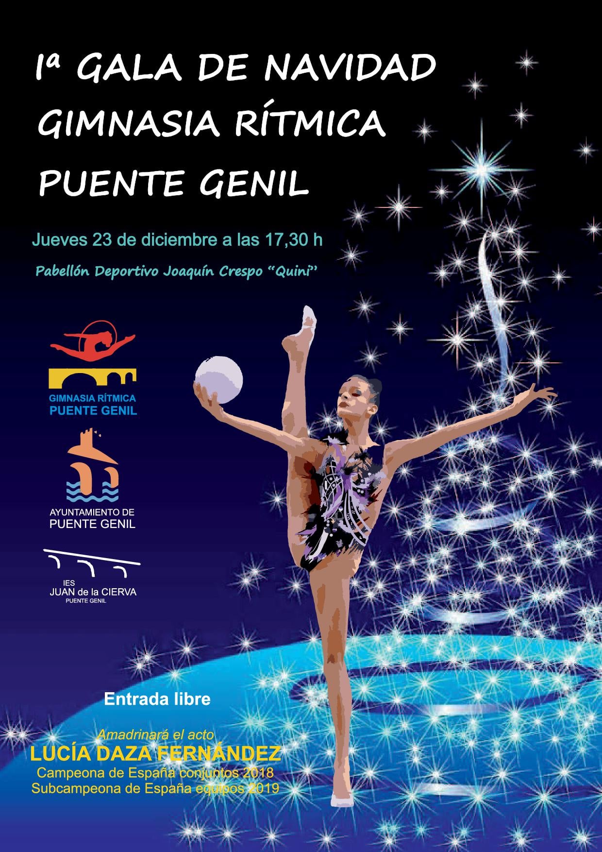 Gimnasia Rítmica Puente Genil, en colaboración con el Ayuntamiento de Puente Genil y el IES Juan de la Cierva, llevará a cabo el 23 de diciembre la Iª Gala de Navidad de Gimnasia Rítmica. El pabellón deportivo Joaquín Crespo "Quini" es el lugar elegido para esta primera toma de contacto de la Gimnasia Rítmica en el municipio. El evento comenzará a las 17,30 h y contará con la presencia de las gimnastas que conforman los diferentes turnos del Club, tanto de nivel escuelas como de precompetición, para realizar exhibiciones de montajes con los que mostrar la evolución obtenida durante estos primeros meses de vida del Club. El acto estará amadrinado por la Campeona de España, Lucía Daza Fernández, que acompañará a las gimnastas en esta cita histórica. La entrada será libre, hasta completar aforo, siendo obligatorio el uso de mascarilla.